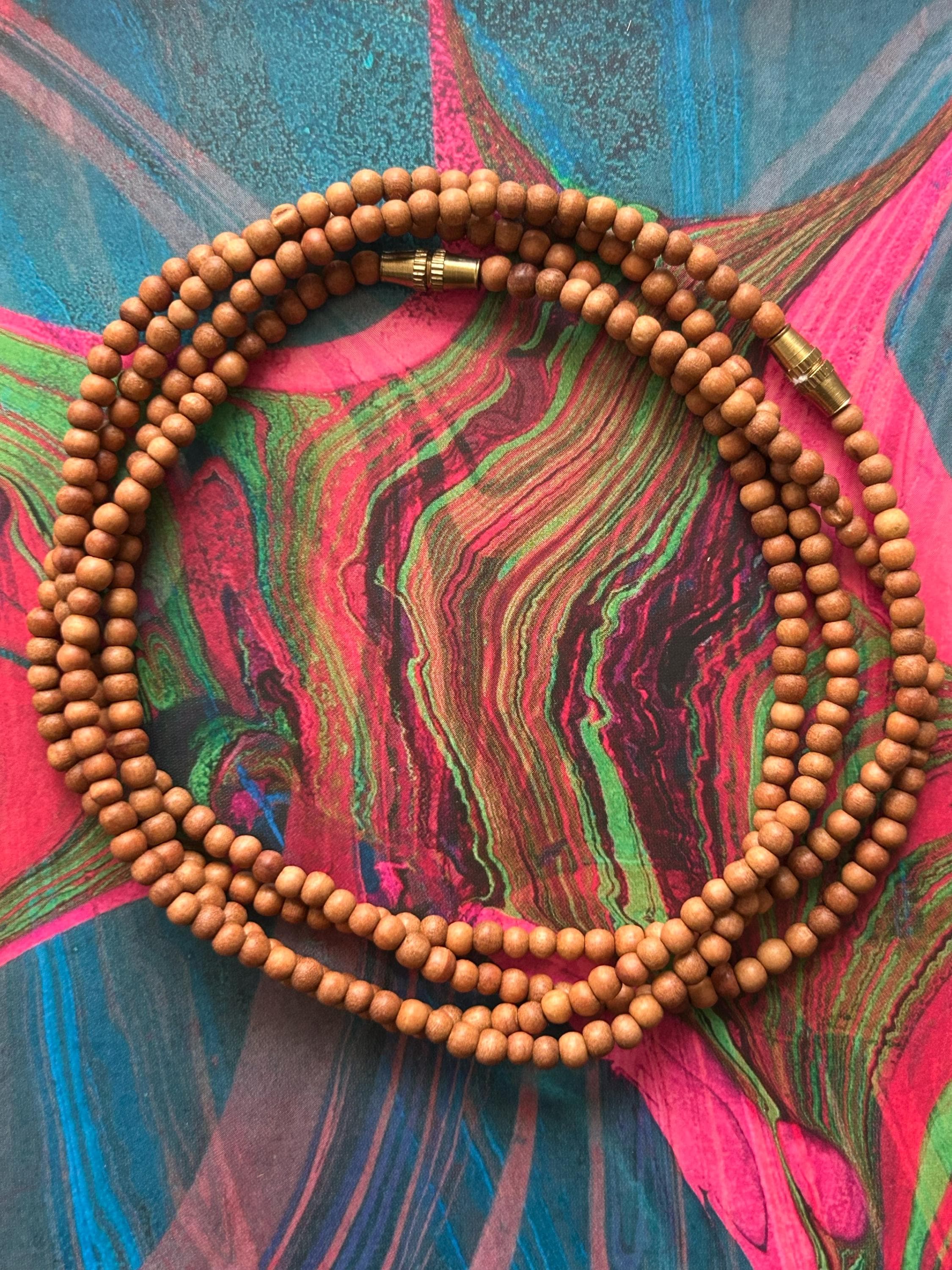 Naturally scented sandalwood bead necklace with small brass clasp. Looks great alone, worn as multiples or wrapped around wrist as a bracelet! As these beads are hand carved and assembled, bead sizes may vary.