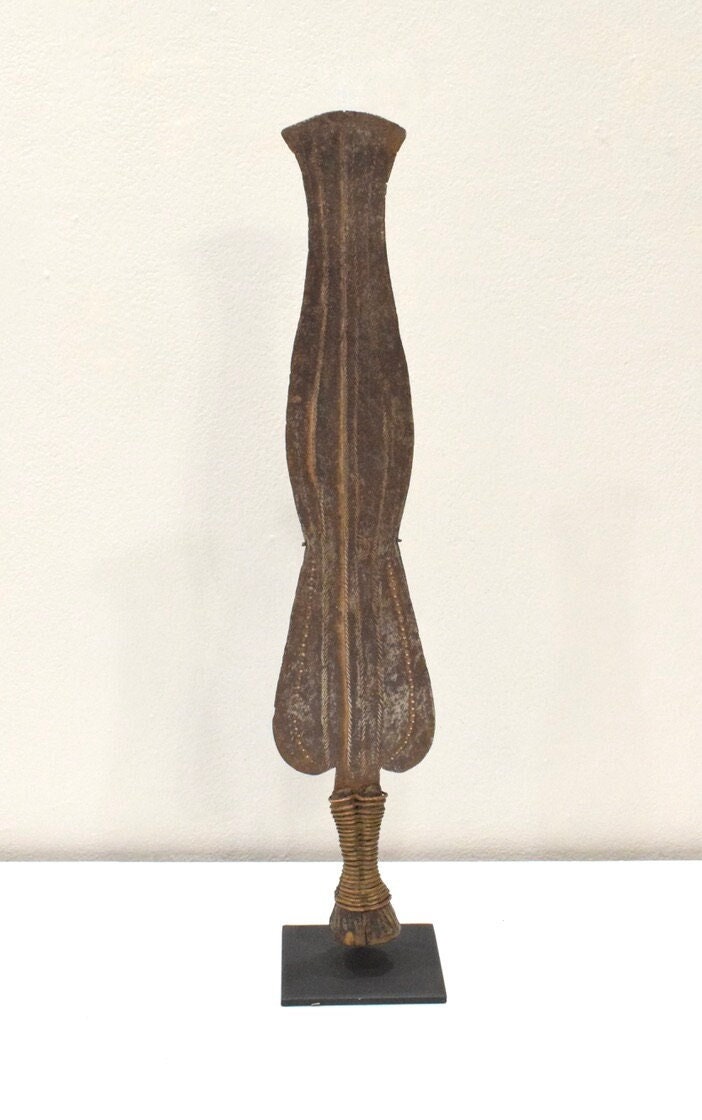 This is a wonderful old Kuba Knife from the Democratic Republic of the Congo. Knives, currency blades and spears, all made of forged iron, attest to the skills in metal of the Kuba and related peoples of central Africa. Most exhibit an inventive variety of form and workmanship far beyond what was functionally necessary. Specialists in the field will identify these pieces much more specifically. The ceremonial knife was introduced by an early Kuba king as a peaceful replacement knife. The hilt is exquisitely decorated by inlaying thousands of wire bits into the wood. Also knives, daggers and swords from the Kuba people are used as prestige items. Historical documents indicate that quantities of them were brought to the Congo by Portuguese and Dutch traders beginning around the 16th century. They were then forged by Congolese blacksmiths to emulate foreign examples. They were reserved for nobles and used for important ceremonial occasions. This old Kuba knife would be a wonderful addition to your home or collection.