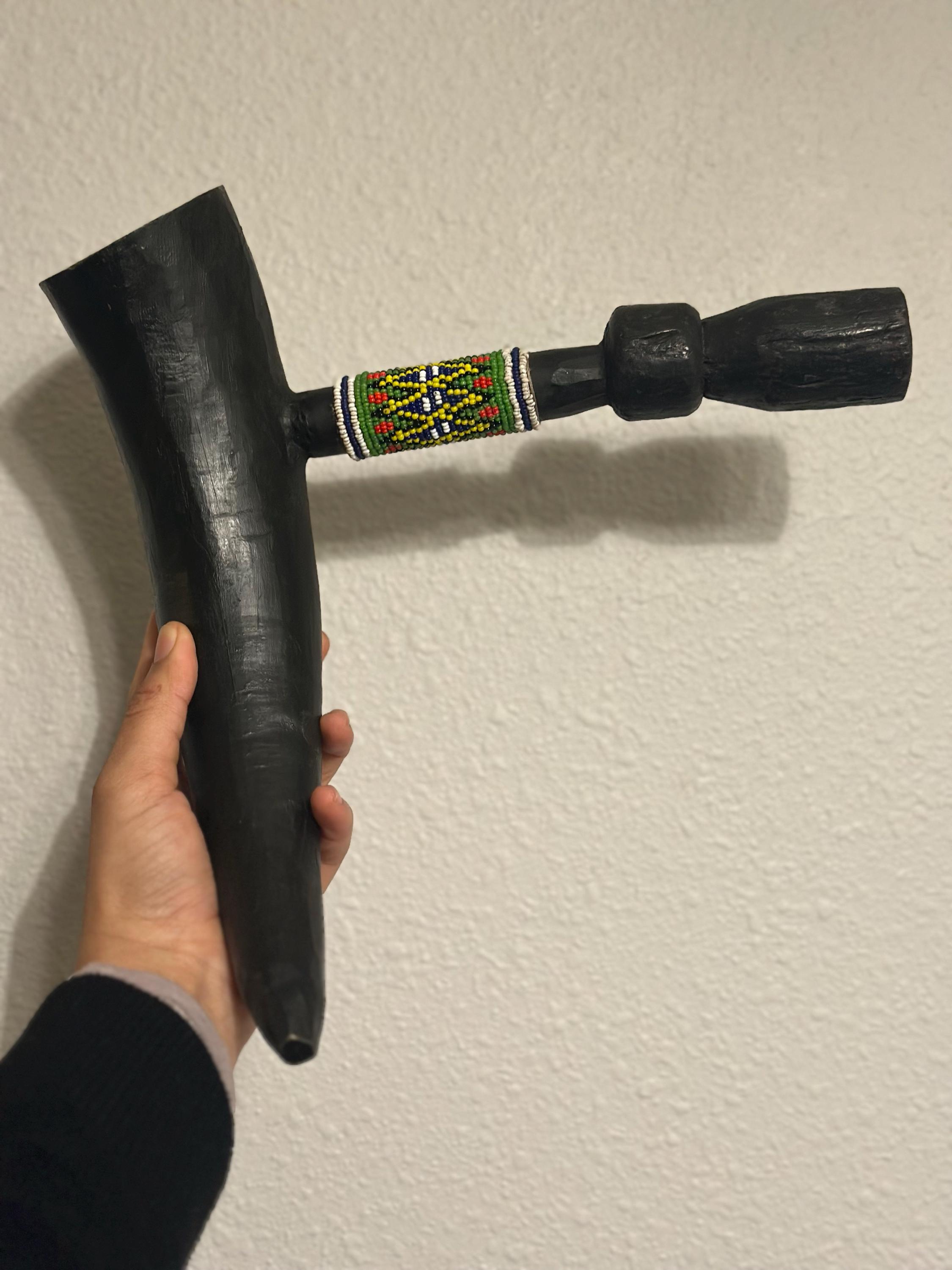 This is a wonderful Vintage Zulu Colorful Beaded Cow Horn Pipe from from South Africa. For many Zulu beaded jewelry and accessories became important markers of identity. Bead work was a visual marker of social position, marital status, ethnic affiliation and location of the family’s homeland. Zulu bead work has been valued as currency, as decoration, and as a marker of identity. This is a lovely old beaded Zulu pipe would be a great addition to your home or collection.