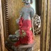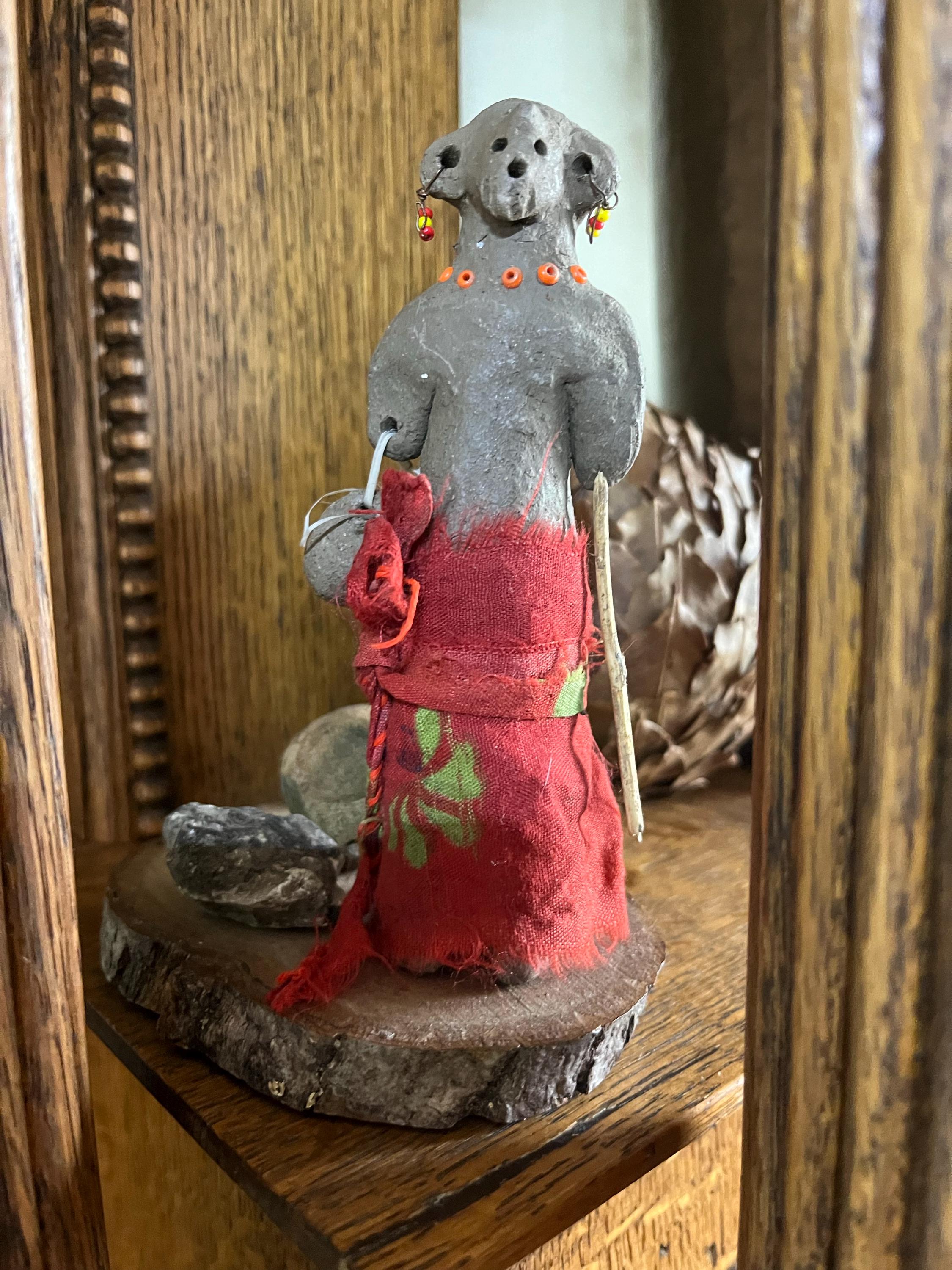 My 6th clay figure, they are SO adorable! Since they are tall and thin, so they don’t break if they should fall off the shelf, I put them on a wood slice base (Michaels) and use a thin stake at the figure’s back which is glued into a drilled hole and then run 2 very thin wires at top and bottom of the material around the body hidden in the material and tether them to the stake. Then I add some rocks for more interest. 😍