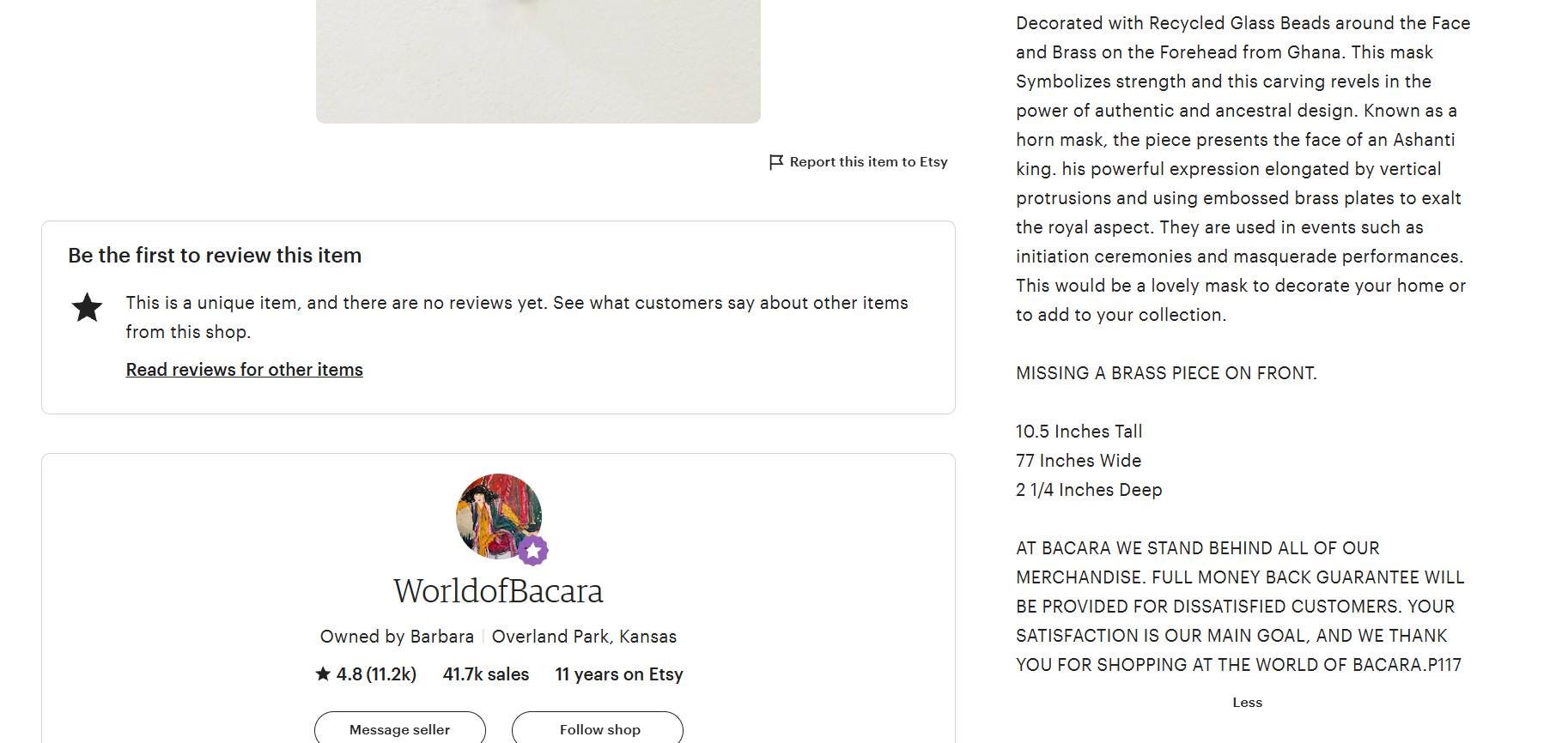 AT BACARA WE STAND BEHIND ALL OF OUR MERCHANDISE. FULL MONEY BACK GUARANTEE WILL BE PROVIDED FOR DISSATISFIED CUSTOMERS. YOUR SATISFACTION IS OUR MAIN GOAL, AND WE THANK YOU FOR SHOPPING AT THE WORLD OF BACARA.P117