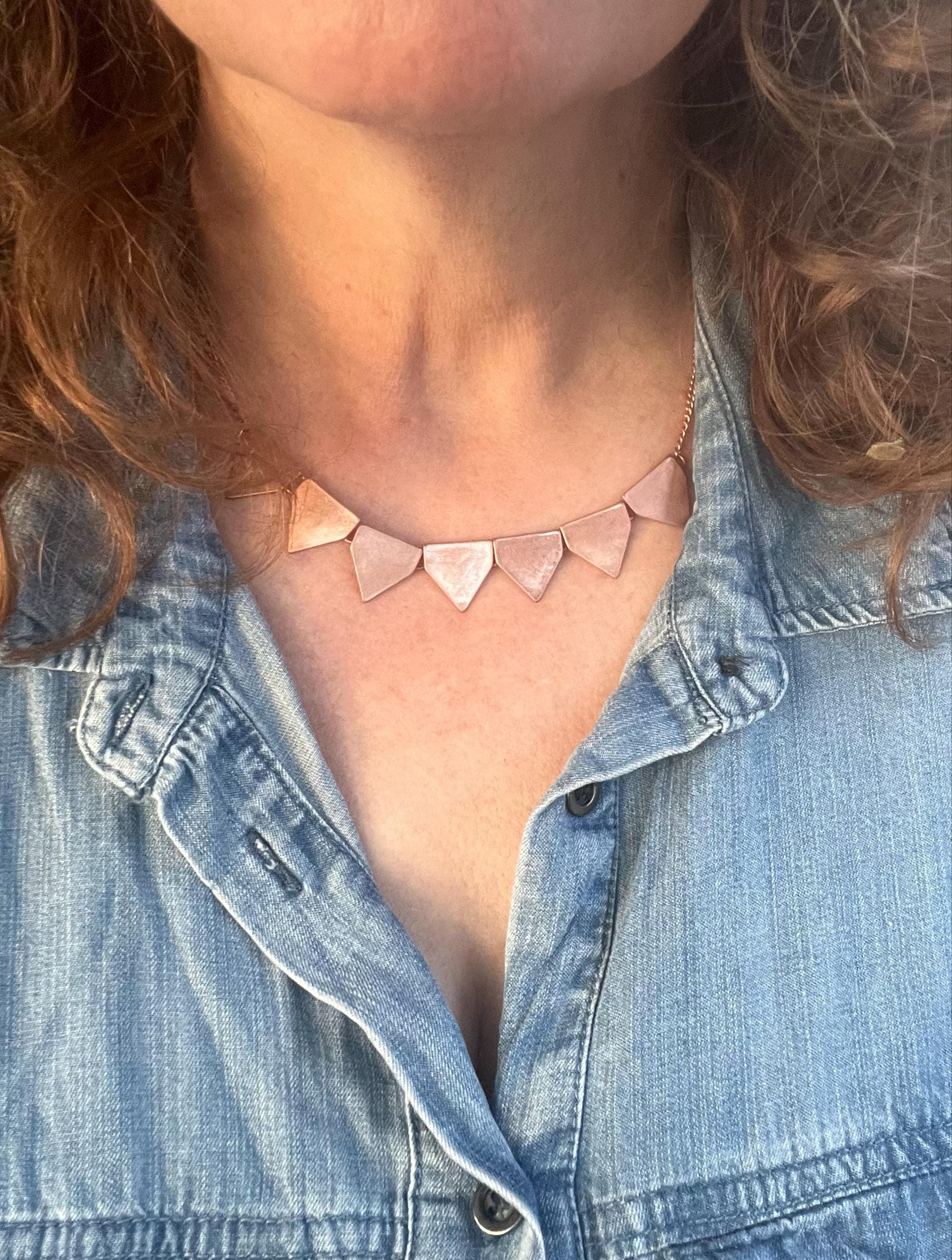 This is Vintage Copper Triangular Pendant Necklace with a Copper Chain and Lobster Claw Extender Clasp. This necklace is medium weight to wear and has a real southwest flair and will compliment any outfit. A great gift to give that special someone during the holiday season.