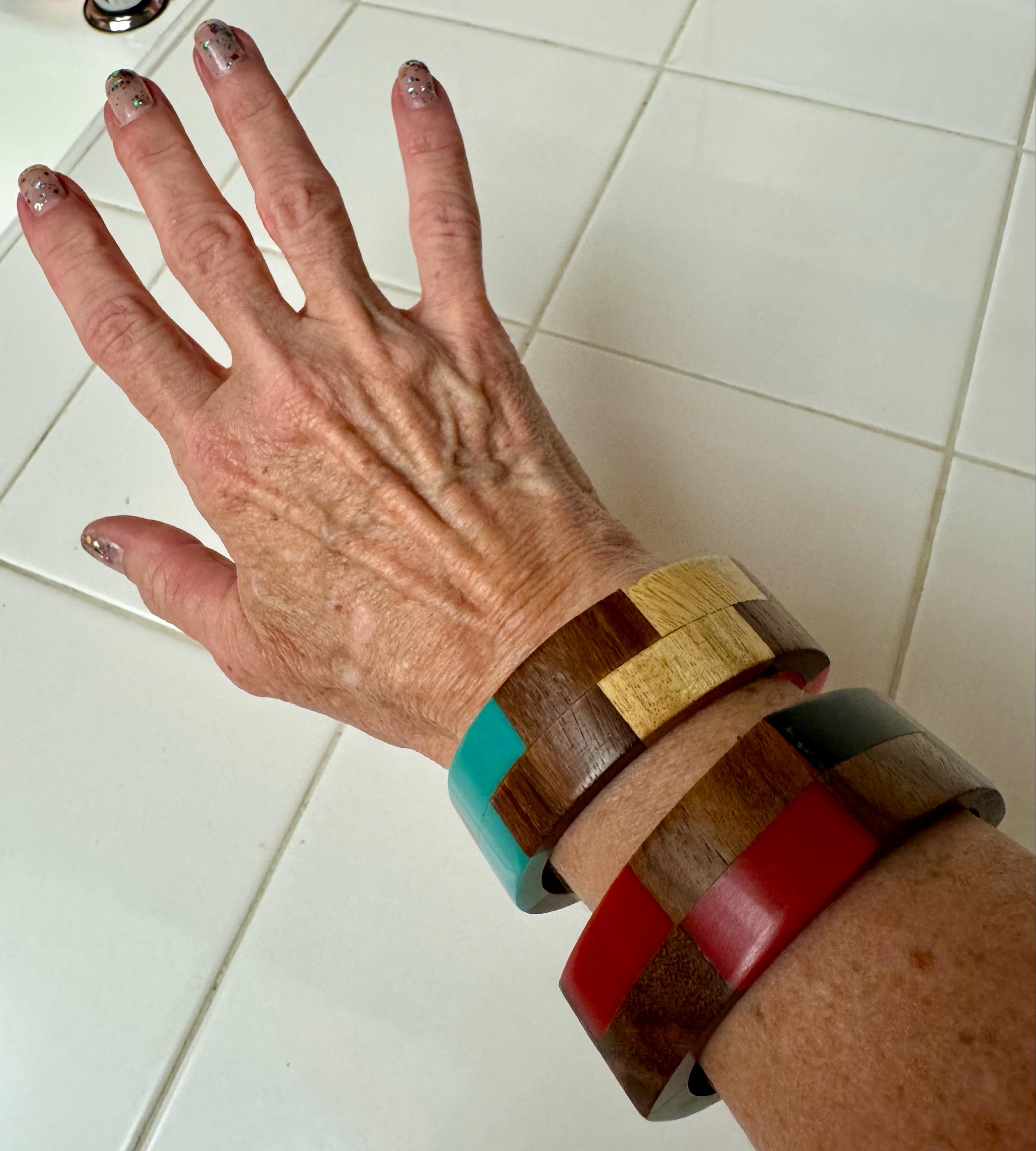 Add a pop of color to your jewelry collection with this handmade wood inlaid resin bangle bracelet. The rectangular wood and resin stones are beautifully crafted with a colorful inlaid design that is sure to make a statement. The bangle bracelet is 3.5 inches in length and made with wood and colored resin materials. Perfect for any occasion, this bohemian-style bracelet is ideal for Mother's Day, Christmas, anniversaries, birthdays, and Valentine's Day. The bracelet is unisex and can be worn by anyone who loves unique and handmade jewelry. Get this vintage-inspired piece from India and add it to your ethnic, regional, and tribal jewelry collection today!