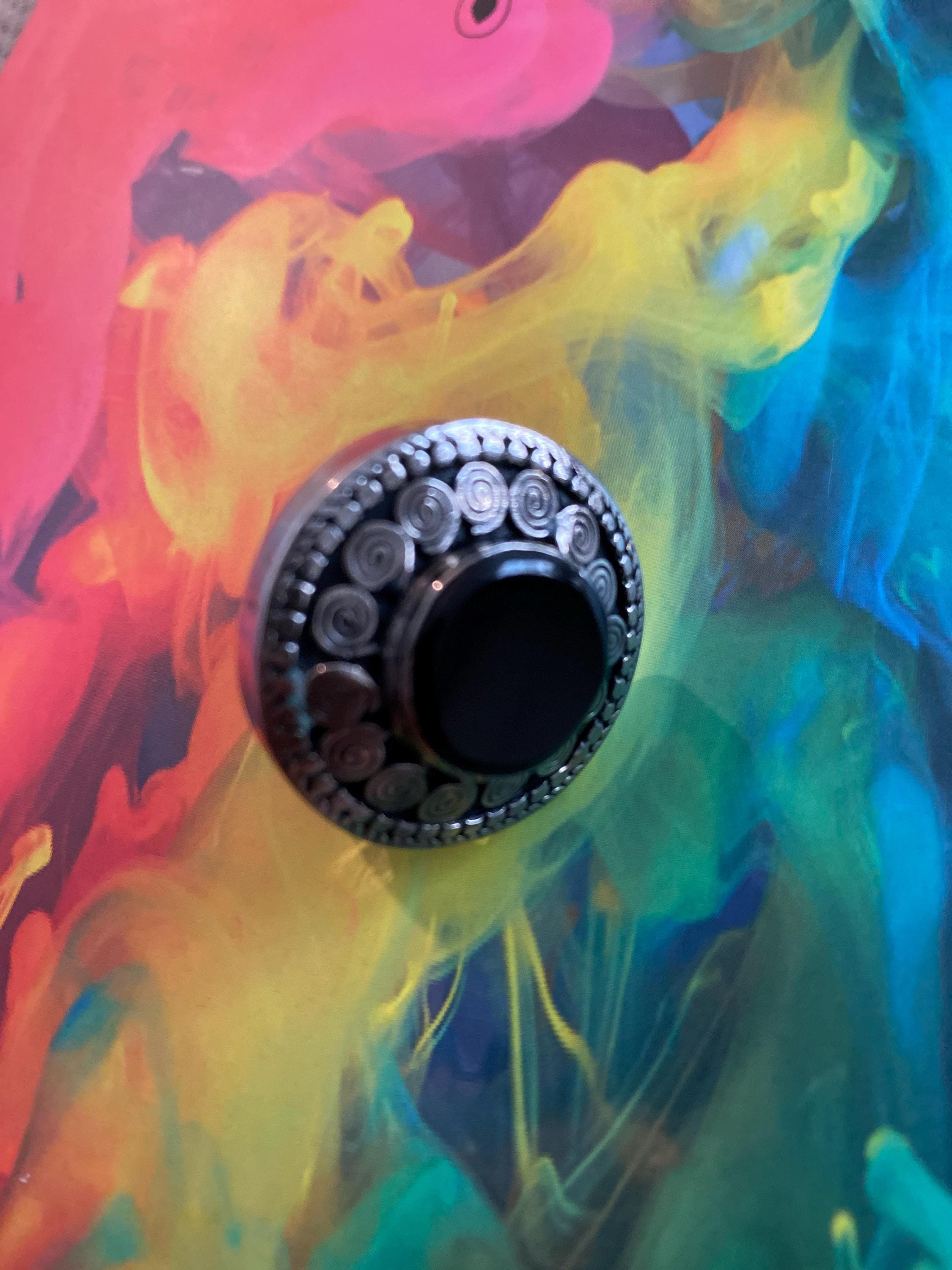 Discover the enchanting allure of this Middle Eastern Silver Black Onyx Ring a stunning accessory that marries traditional craftsmanship with a modern aesthetic. The onyx stone at its center captures the light, lending an eye-catching sparkle to your every movement, while the sleek silver band provides a sophisticated contrast. Adorn your finger with this unique piece of Vintage Kuchi Silver Tribal Ring.