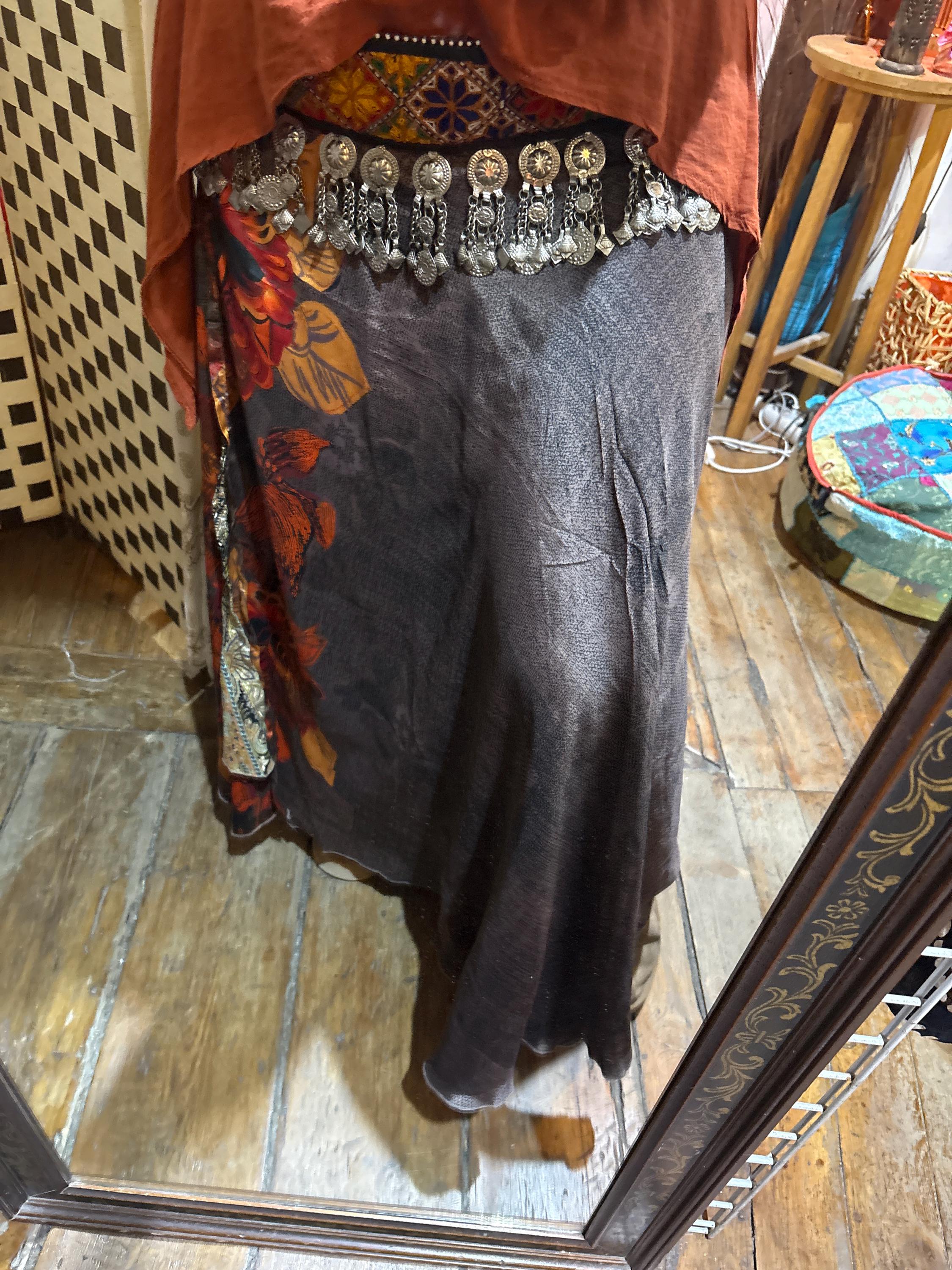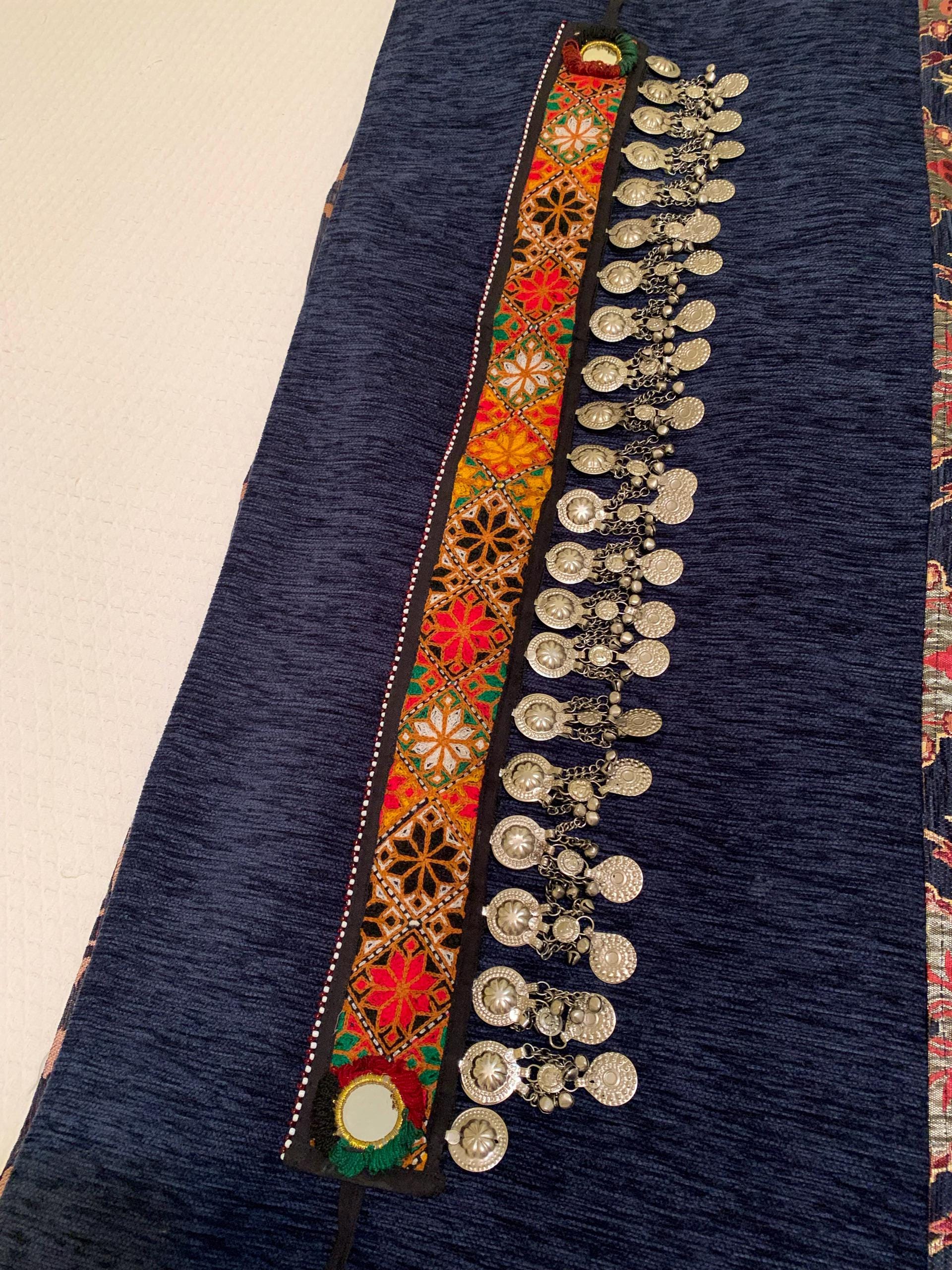 This is a beautiful hand woven and handmade Kuchi Beaded Tassled Dance Belt with Buttons and Silver Dangles from the Middle East. Kuchi is a word word that means " those who go on migrations". The Kuchi are Pashtun nomads who maintained their nomadic lifestyle for more than 3000 years. They live throughout Central Asia and their jewelry is renowned for its vibrant energy, exuberant colors and creative spirit. This is a beautiful tribal textile belt with buttons, woven fabric, beaded tassels, bells and beautiful silver embellishments and white bead trim along the top. This type of belly dancing belt makes wonderful sounds with each movement. This unique belt would be beautifully displayed in your home, it can be worn or it would make a wonderful gift.