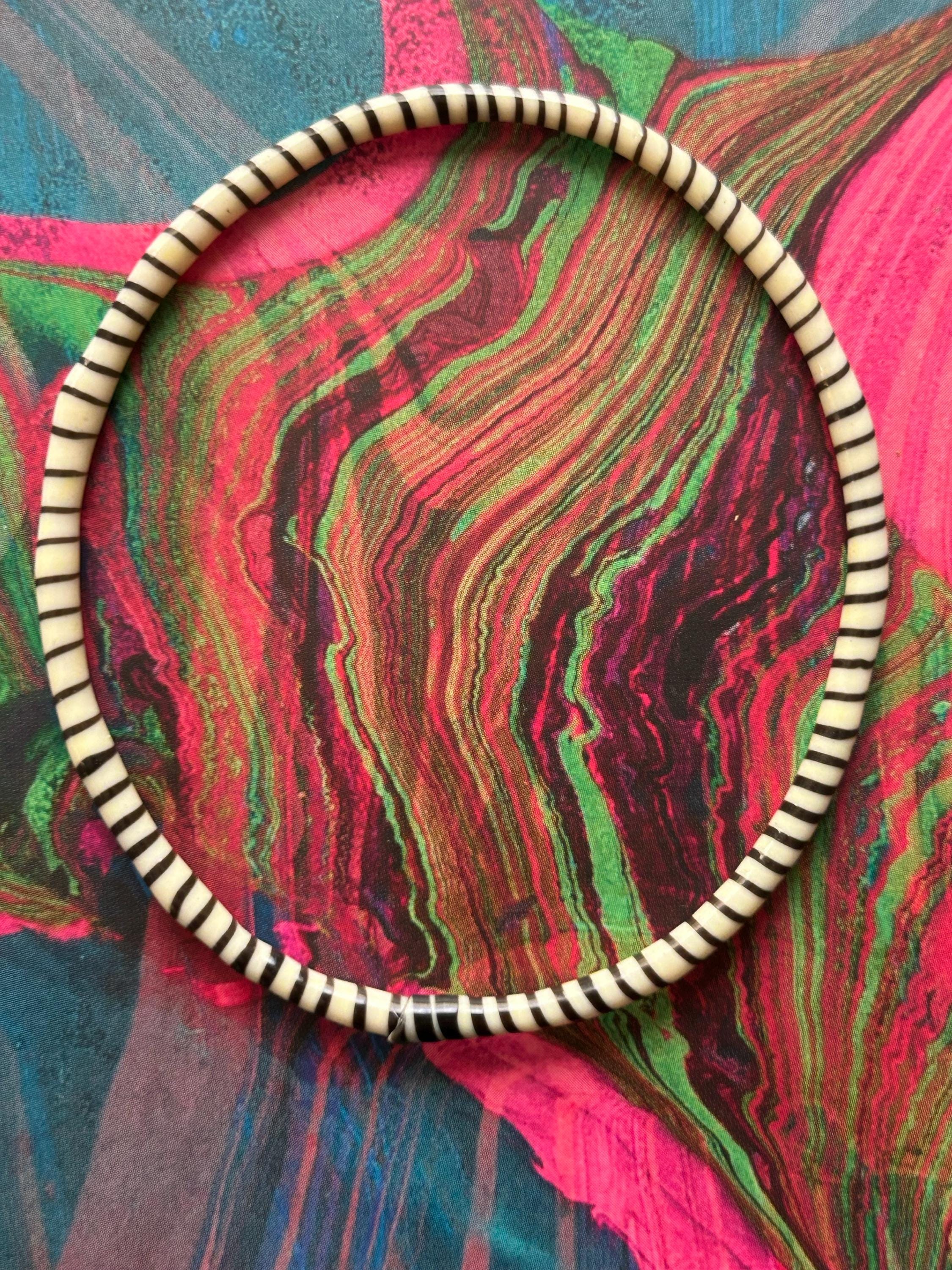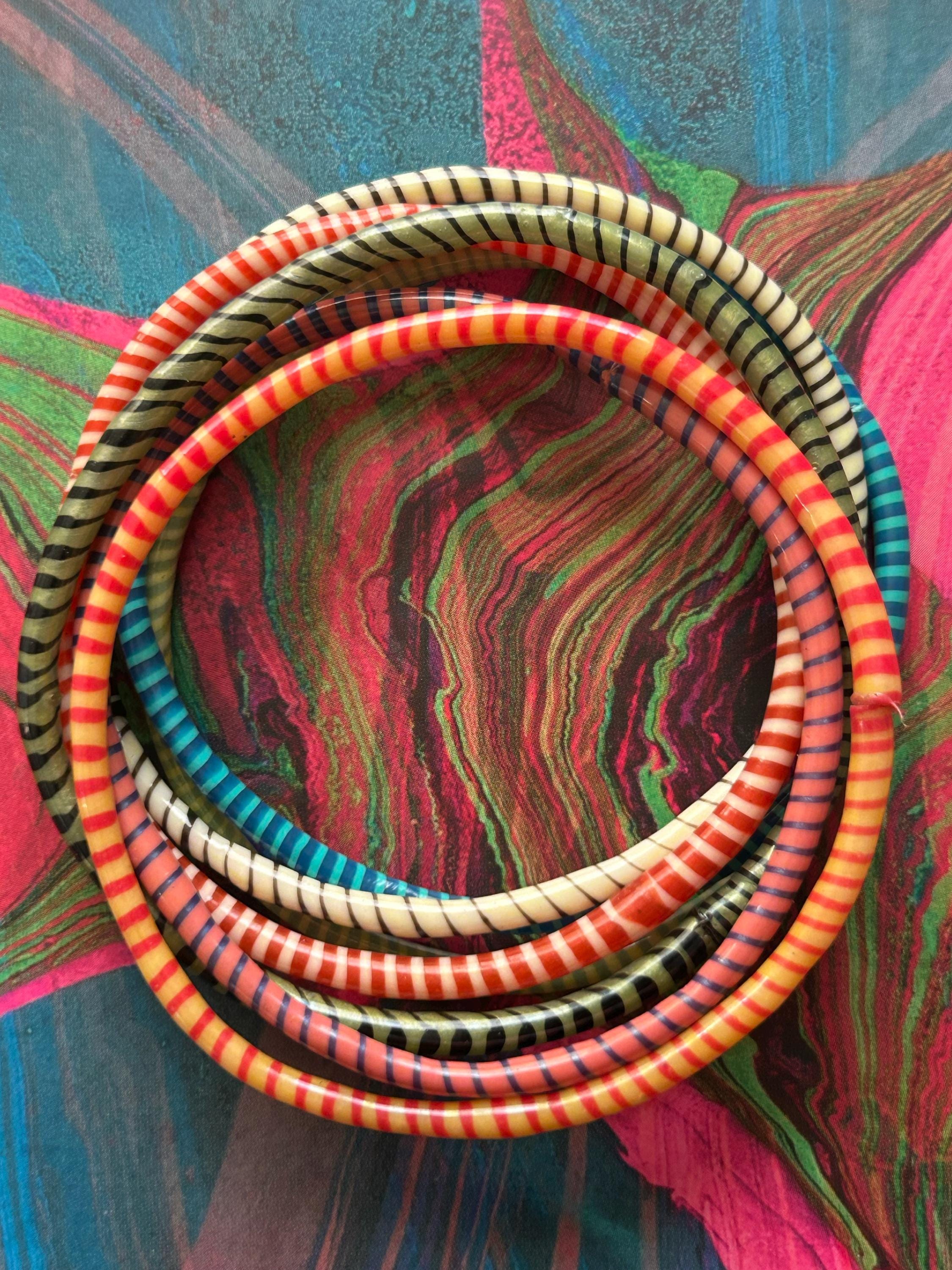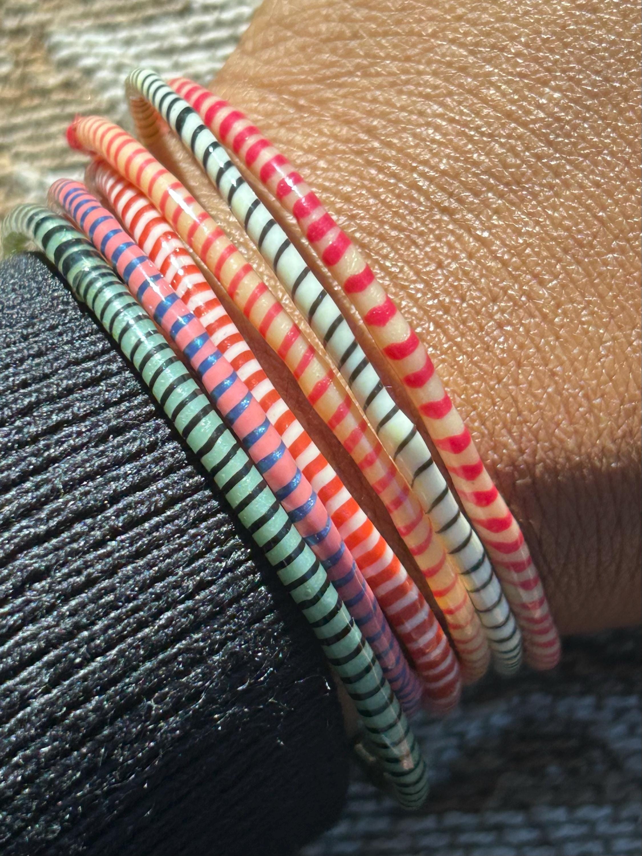 These are wonderful and colorful African Plastic Telephone Wire Bracelets. These bracelets are made from stripped recycled African telephone wire and come in a wide variety of colors and are great to stack like bangles. They create a great rainbow of colors on your wrist. Bracelets are sold individually. These are great gifts for men, women, boys and girls.