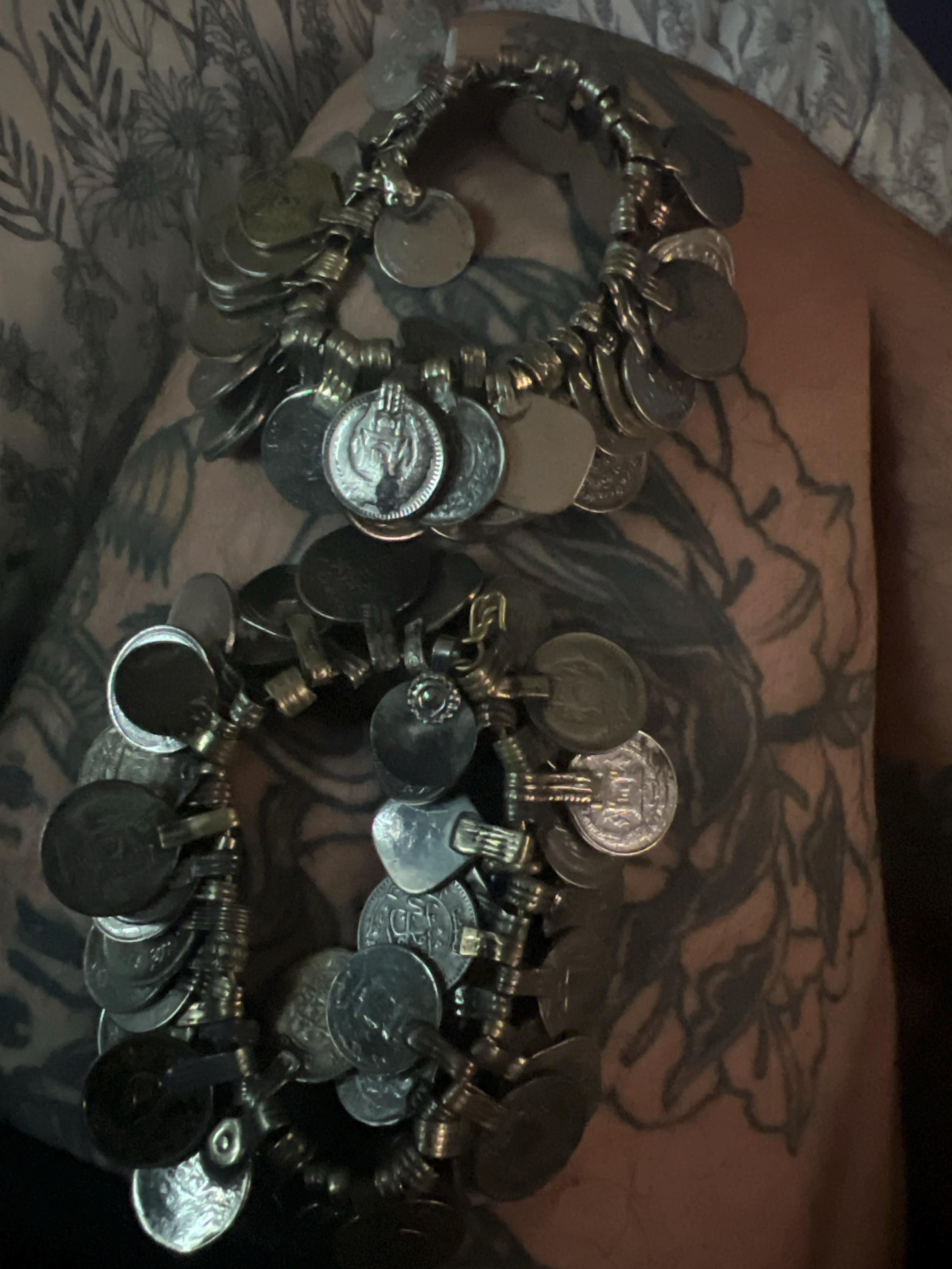 This is a wonderful Ring of Assorted Silver Kuchi Coins from the Middle East. The Kuchi are a nomadic group of people living throughout Central Asia who have traveled freely across international boundaries for centuries. Kuchi jewelry is renowned for its vibrant energy, exuberant designs, and flamboyant spirit. It is alive with color and over-the-top embellishments, which some might consider gaudy, but which Tribal Jewelry aficionados recognize as uniquely Kuchi. This jewelry is especially popular for dance and daily wear, combining the vitality of the multiple cultures and traditions that the Kuchi people visit in their wanderings. It is perhaps the most fun to wear of all the Tribal Jewelries. Kuchi women have long worn large amounts of jewelry and other colorful jingling finery and hair ornaments. One theory suggests that jewelry and other adornment creates a sense of beauty and refinement in otherwise drab surroundings. These coins would be wonderful in all your creative jewelry designs.