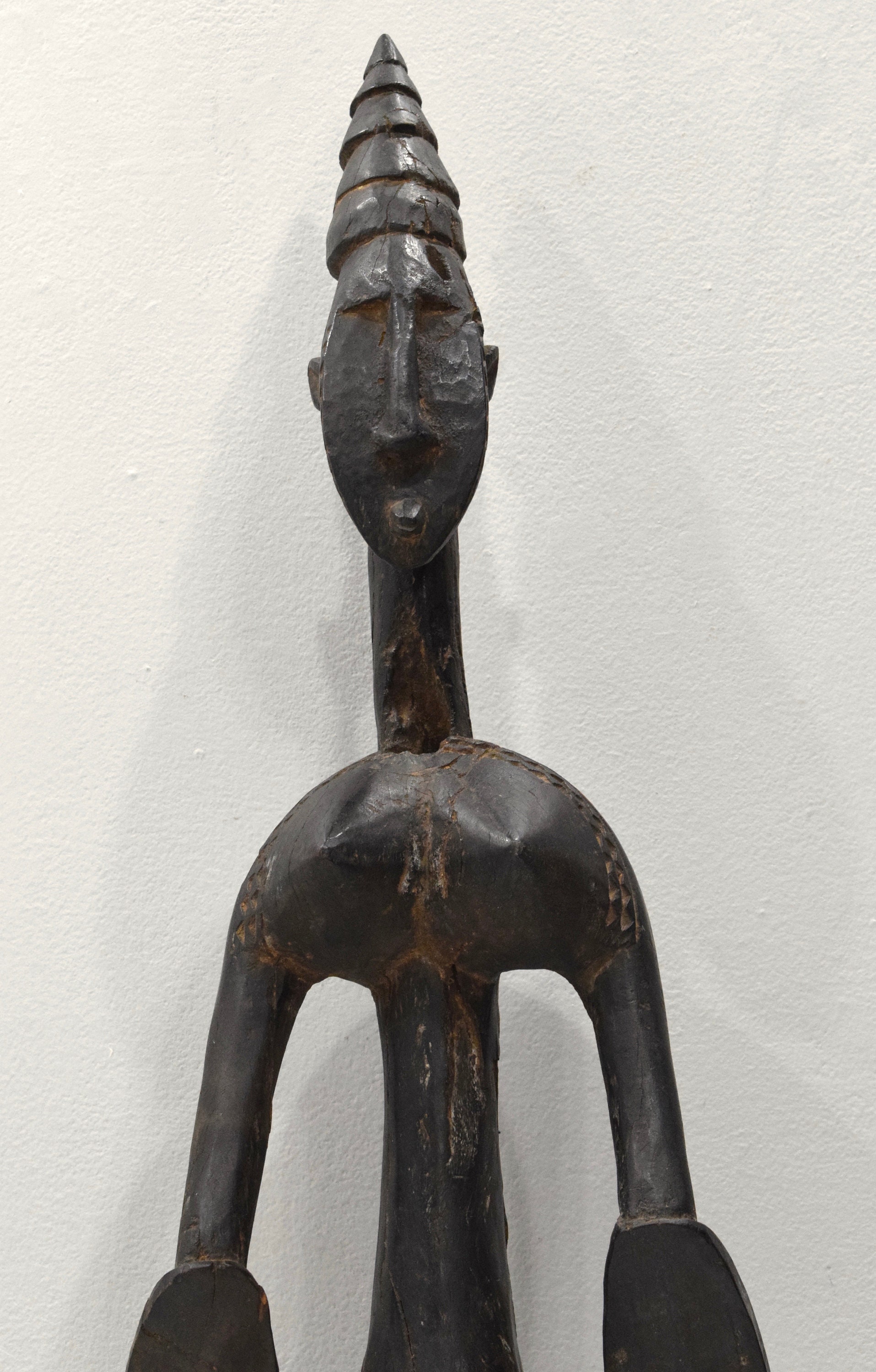 This is a fabulous Old Dogon Carved Wood Statue from the Dogon Tribe of Mali. The Dogon social and religious organizations are closely interlinked and out of this arose principal cults, which accounts for the richness and diversity of Dogon culture and art. The clans are subdivided onto lineages, overseen by the patriarch, guardian of the clan’s ancestral shrine and officiant at the totemic animal cult. Beside this hierarchical system of coming from the same ancestors, male and female associations are entrusted with the initiations that take place by age group, corresponding to groups of newly circumcised or excised boys or girls. The Dogon believe these operations remove the female element from males and vice versa. Circumcision thus creates a wholly male or female person prepared to assume an adult role. The members of an age group owe one another assistance until the day they die. Initiation of boys begins after their circumcision, with the teaching of the myths annotated by drawings and paintings. The young boys will learn the place of humans in nature, society, and the universe. The first Dogon primordial ancestors, called Nommo, were bisexual water gods. They were created in heaven by the creator god and descended from heaven to earth in an ark. This unique Dogon statue will be wonderful in your home or collection.